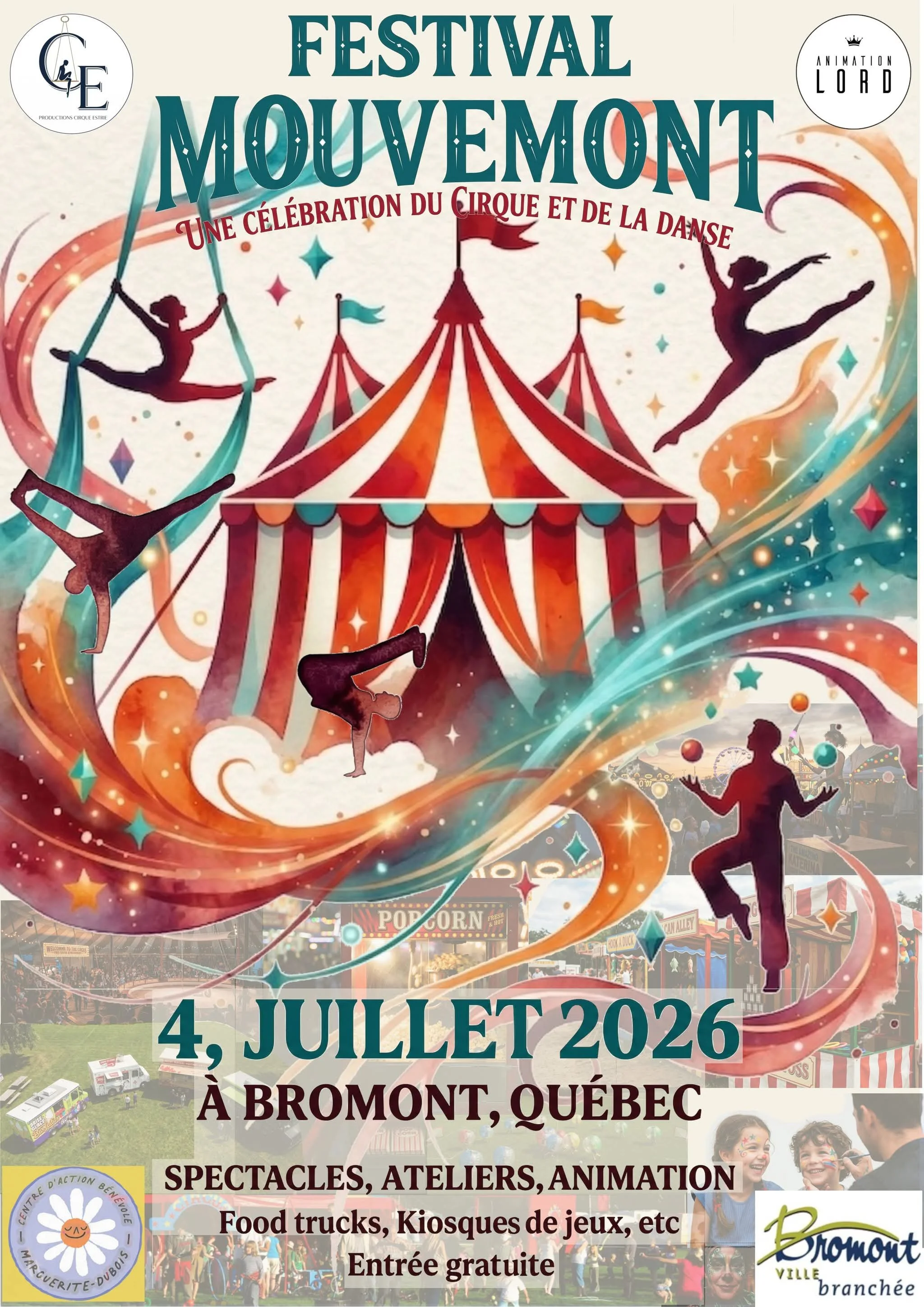 Presented by Productions Cirque Estrie and Animation Lord, Festival MouveMont offers a full day of engaging activities for all ages. Attendees can enjoy captivating live performances, discover new talents through act presentations, and even try their hand at circus arts in interactive workshop and trial zones.